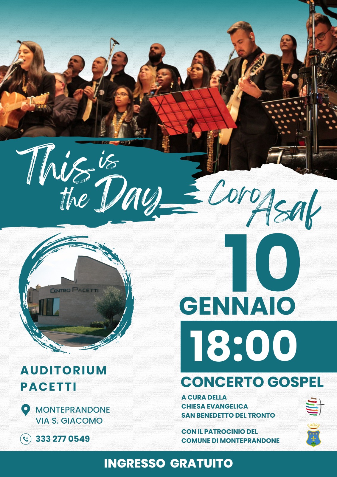 Il Coro Gospel Asaf della Chiesa Evangelica di San Benedetto del Tronto invita la cittadinanza a partecipare al concerto “This Is the Day”, un evento gratuito che si terrà sabato 10 gennaio alle ore 18:00 presso il Centro Pacetti di Monteprandone, con il patrocinio del Comune di Monteprandone e il sostegno dell’associazione Il Germoglio ODV.