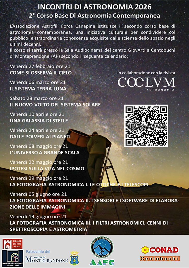 L’iniziativa culturale è patrocinata dal Comune di Monteprandone e si terrà di venerdì, dalle 21 alle 23, nelle seguenti date: 27 febbraio, 6 e 28 marzo, 10 e 24 aprile, 8, 22 e 29 maggio, 5 e 19 giugno 2026. Per conoscere nel dettaglio il programma di ogni incontro visita il sito dell’associazione www.astroforcacanapine.it/corsoastronomia.html.