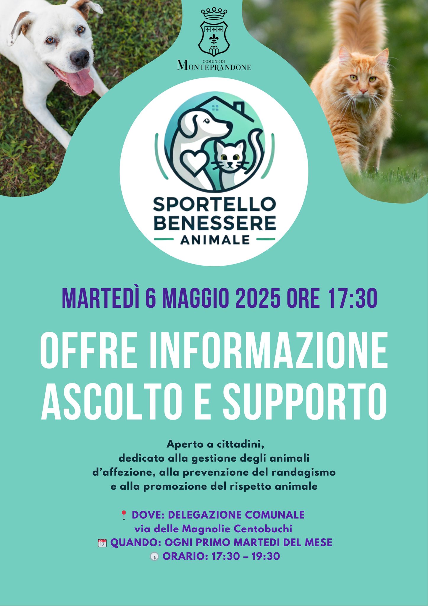 È attivo a Monteprandone lo Sportello Benessere Animale, un nuovo servizio gratuito rivolto a tutta la cittadinanza, con l’obiettivo di promuovere una gestione consapevole, rispettosa e informata degli animali d’affezione.