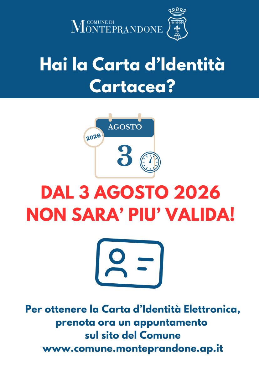 Per evitare attese eccessive in prossimità del 3 agosto 2026 si invitano i cittadini che sono ancora in possesso del documento cartaceo a programmare per tempo il proprio appuntamento, anche in considerazione del fatto che la carta d’identità elettronica viene consegnata entro sei giorni lavorativi dalla data di emissione (da tenere presente se si programma un viaggio all’estero)